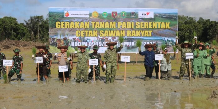 Kutai Timur – Komandan Korem 091/Aji Surya Natakesuma (Danrem 091/ASN) Brigjen TNI Anggara Sitompul bersama Bupati Kutai Timur serta unsur Forum Koordinasi Pimpinan Daerah (Forkopimda) melaksanakan kegiatan Gerakan Tanam Padi
