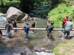 Kerja Sama TNI dan Warga Desa Cahaya Batin Bersihkan Area Jembatan Gantung