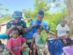 Manokwari, Papua Barat — Saat menjalani program pembangunan TMMD ke-128 yang sibuk, anggota Satgas Kodim 1801/Manokwari mengambil waktu untuk berinteraksi dengan anak-anak di Kampung Tanah Rubuh, Distrik Manokwari Utara, pada