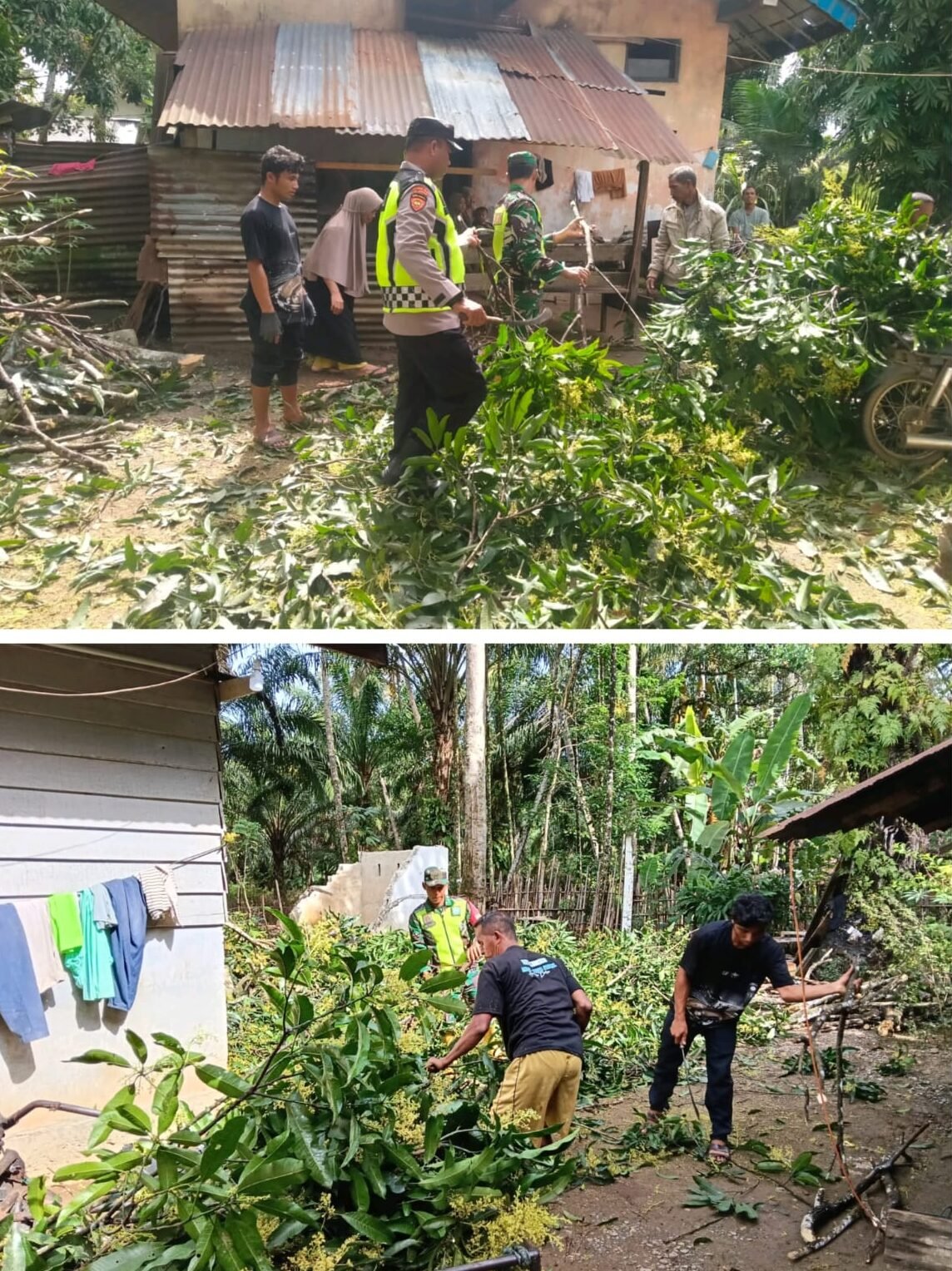 Babinsa Sertu Agus S. dan Bhabinkamtibmas Bripka M. Hamid sigap turun ke lokasi begitu menerima informasi dari warga. Dengan peralatan sederhana, mereka bersama masyarakat bahu-membahu memotong serta menyingkirkan batang dan ranting pohon agar tidak lagi membahayakan penghuni rumah maupun warga sekitar.