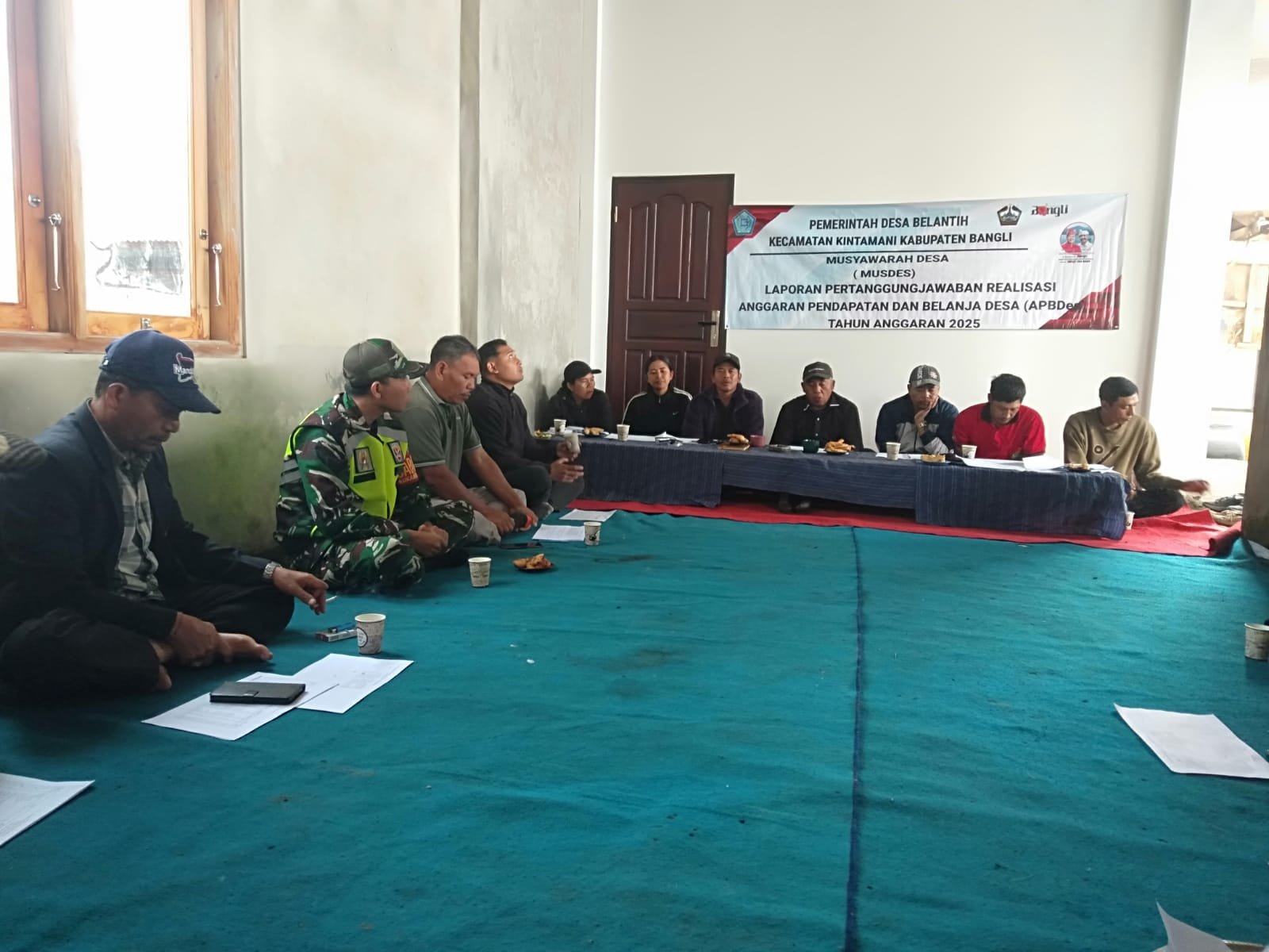 Musdes kali ini berfungsi sebagai forum resmi bagi pemerintah desa untuk menginformasikan secara transparan dan akuntabel mengenai penggunaan anggaran desa kepada seluruh warga. Hadir dalam acara tersebut Kepala Desa Belantih I Nengah Wardana, Ketua Badan Permusyawaratan Desa (BPD) I Made Sudimawan, serta sejumlah pejabat desa lainnya, termasuk Bhabinkamtibmas Brigadir I Made Rupawan dan PLKB I Wayan Tantiani.