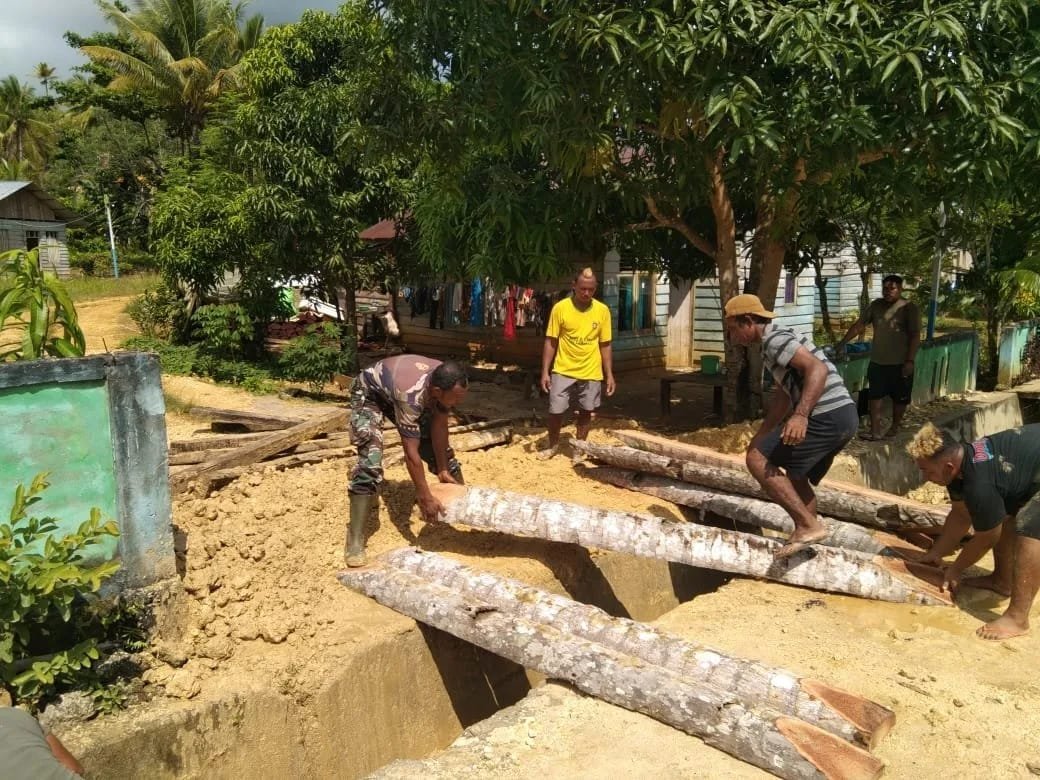 Babinsa Kodim 1505 Tidore Bersama Warga Bangun Gorong-Gorong Darurat di Desa