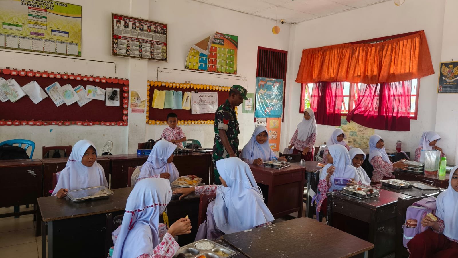 ACEH JAYA – Babinsa Koramil 01/Jaya Kodim 0114/Aceh Jaya, Kopka Irman, melaksanakan pemantauan kegiatan pendistribusian makanan bergizi bagi siswa di SD Negeri 2 Jaya, Desa Pasar Lamno, Kecamatan Jaya, Kabupaten Aceh Jaya, Rabu (08/04/2026). Kegiatan ini dilakukan untuk memastikan penyaluran bantuan makanan kepada para siswa berjalan dengan tertib dan tepat sasaran.