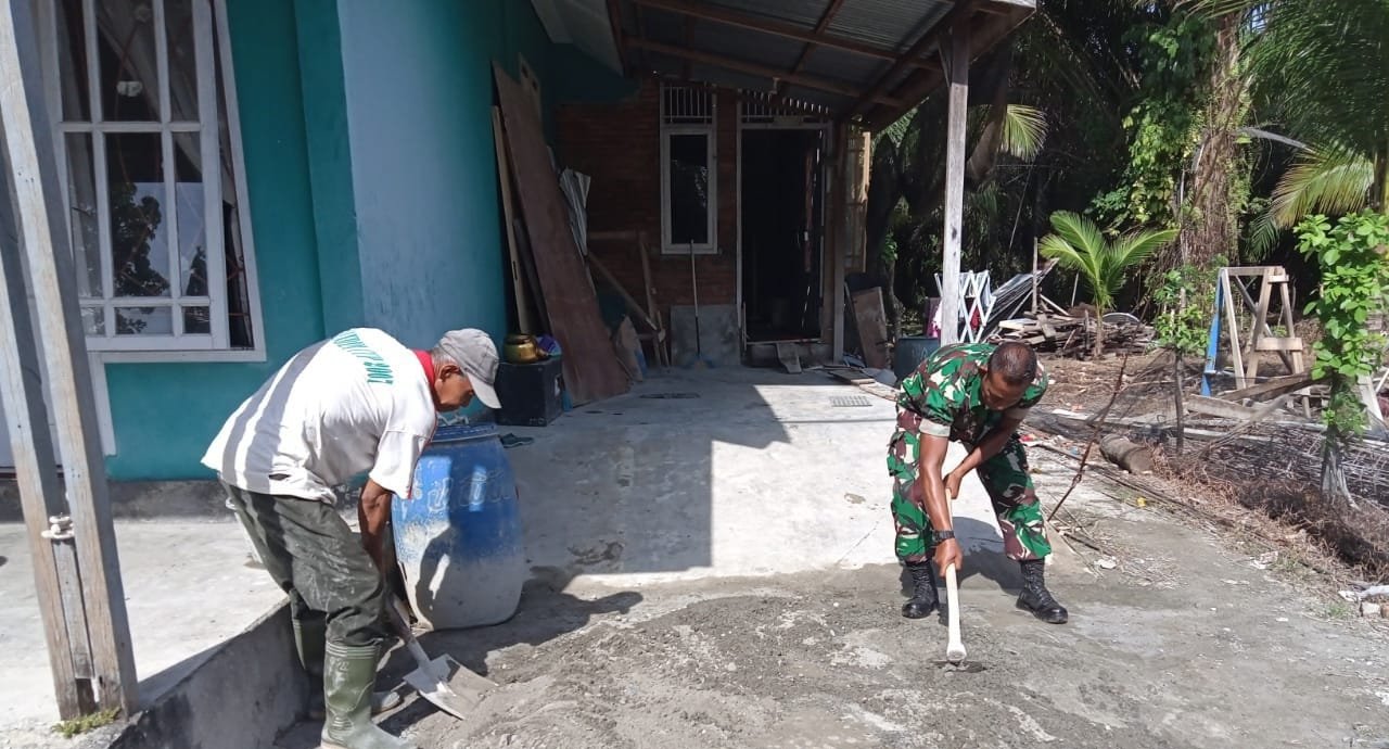 ACEH BARAT – Sebagai upaya mengatasi kesulitan sekaligus mewujudkan tempat tinggal yang layak huni, Babinsa Koramil 04/Mrb Kodim 0105/Abar Serda Edi Hermanto berperan aktif melibatkan diri secara langsung dan turut berjibaku mengaduk adonan pasir dan semen sebagai bahan material percepat proses pembangunan salah satu rumah warga binaan yang beralamatkan di Desa Peunaga Rayeuk Kecamatan Meureubo, Senin (4/11/2024)