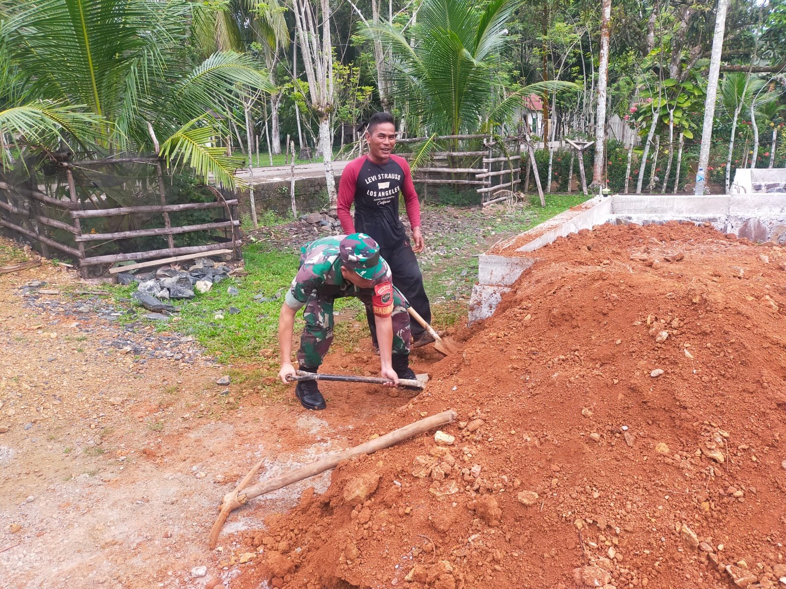 ACEH JAYA – Babinsa Koramil 05/Panga Kodim 0114/Aceh Jaya, Serda Suryadi Putra, melaksanakan kegiatan karya bakti dengan membantu memasukkan tanah timbunan pada pondasi rumah milik salah seorang warga binaan, Tarmudin (41), di Desa Gampong Harapan, Kecamatan Panga, Kabupaten Aceh Jaya, Minggu (28/12/2025).