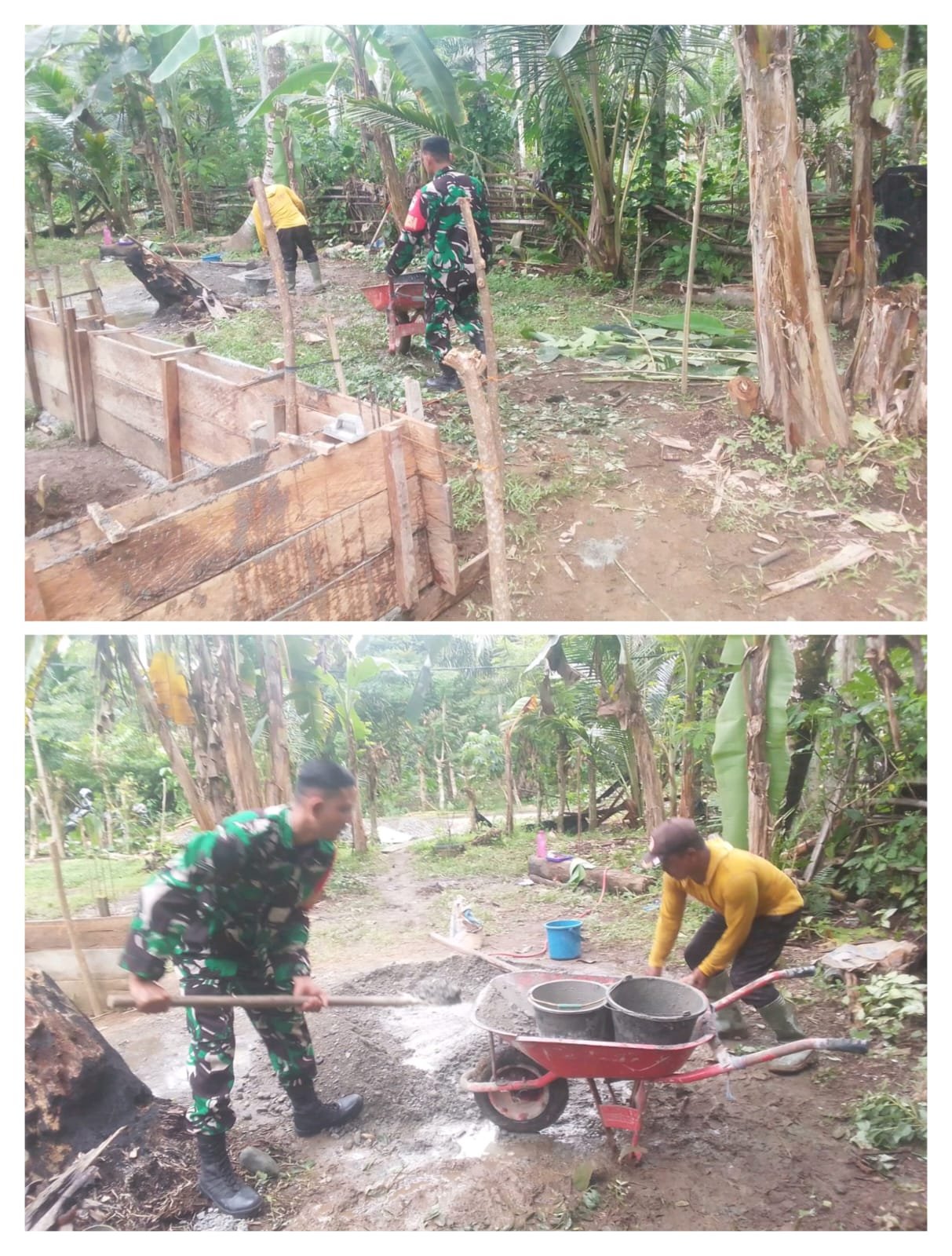ACEH BARAT – Babinsa Koramil 08/Arongan Lambalek Kodim 0105/Aceh Barat, Serda Feri Irawan, membantu warga mengaduk semen guna mempercepat pembangunan pondasi rumah milik warga di Desa Peuribu, Kecamatan Arongan Lambalek, Kabupaten Aceh Barat, Jumat (02/01/2026).