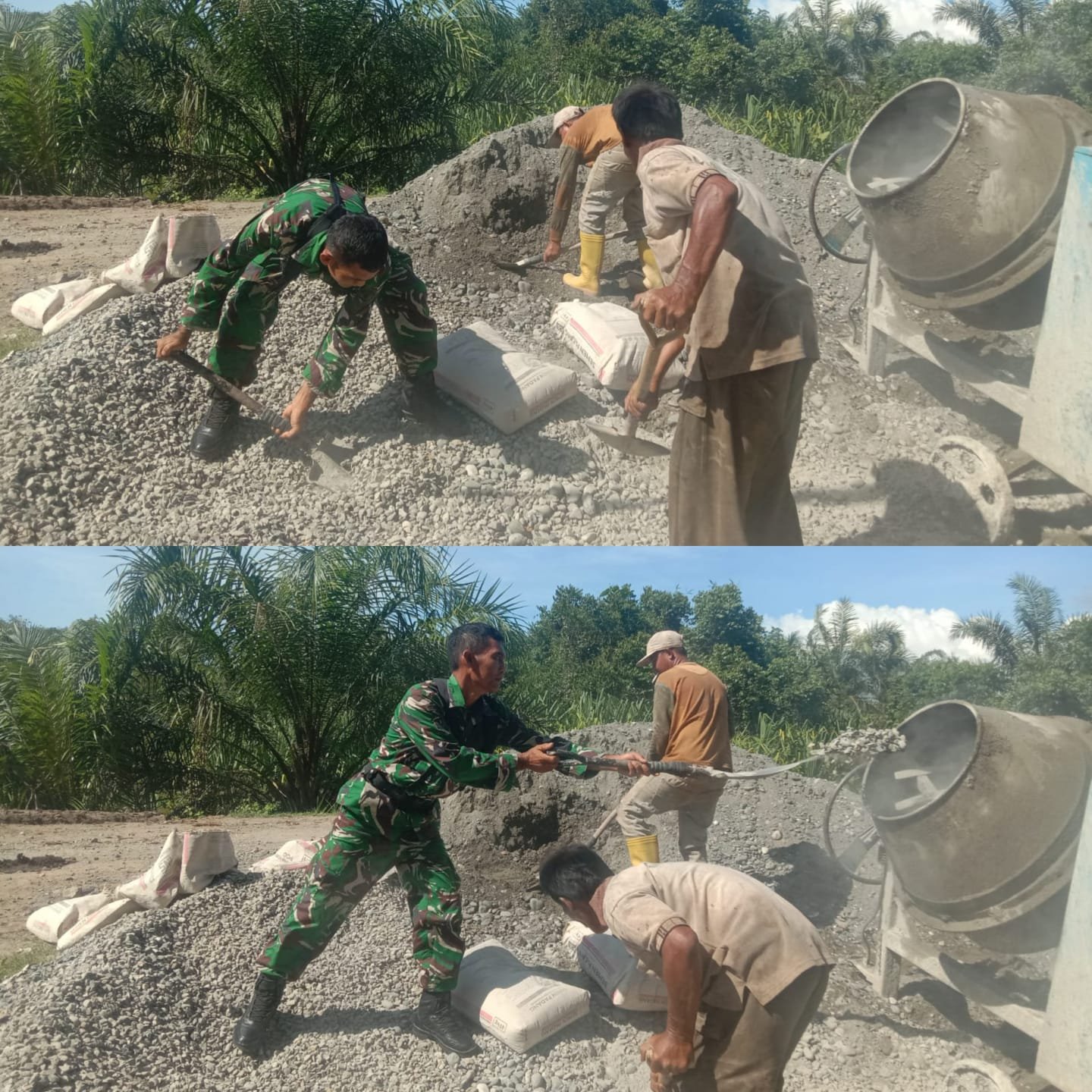 Di tengah terik matahari dan suasana kerja yang penuh semangat, Sertu Buchari Muslim terlihat bahu-membahu bersama warga, mengaduk semen, mengangkat material bangunan, serta mengarahkan proses pengecoran agar berjalan lancar. Kegiatan ini merupakan bagian dari upaya bersama untuk memperbaiki akses jalan desa yang selama ini menjadi jalur utama aktivitas masyarakat, baik untuk keperluan ekonomi, pendidikan, maupun sosial.
