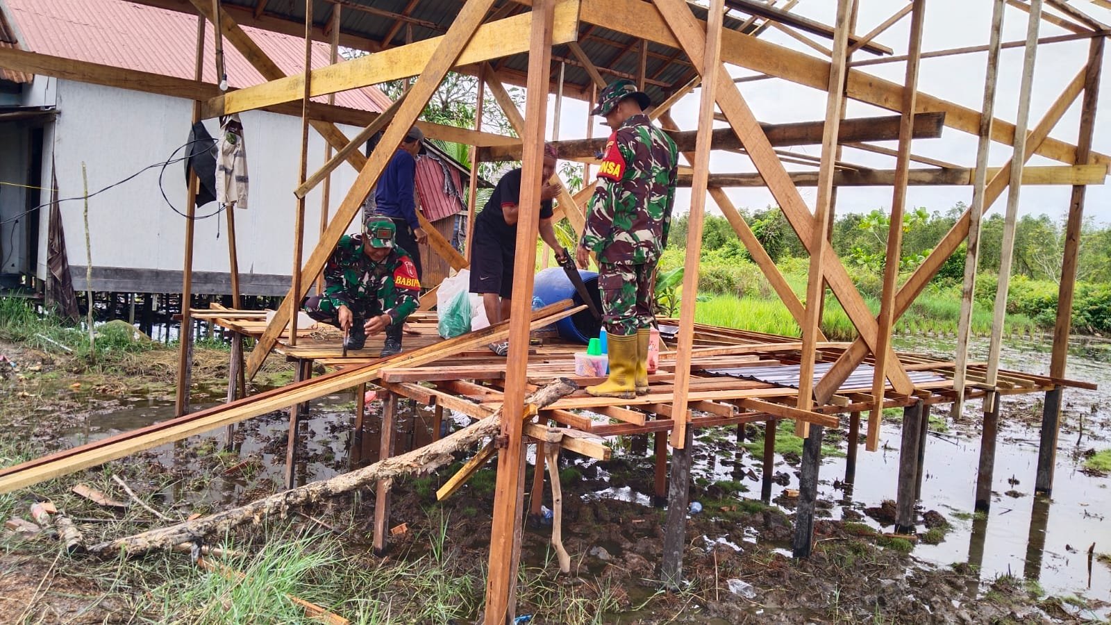 Pembangunan rumah panggung tersebut dilakukan di area berlahan basah sehingga membutuhkan kerja sama dan tenaga ekstra saat mengangkat dan memasang rangka kayu. Meski demikian, kebersamaan antara Babinsa dan warga membuat pekerjaan terasa lebih ringan dan cepat selesai.