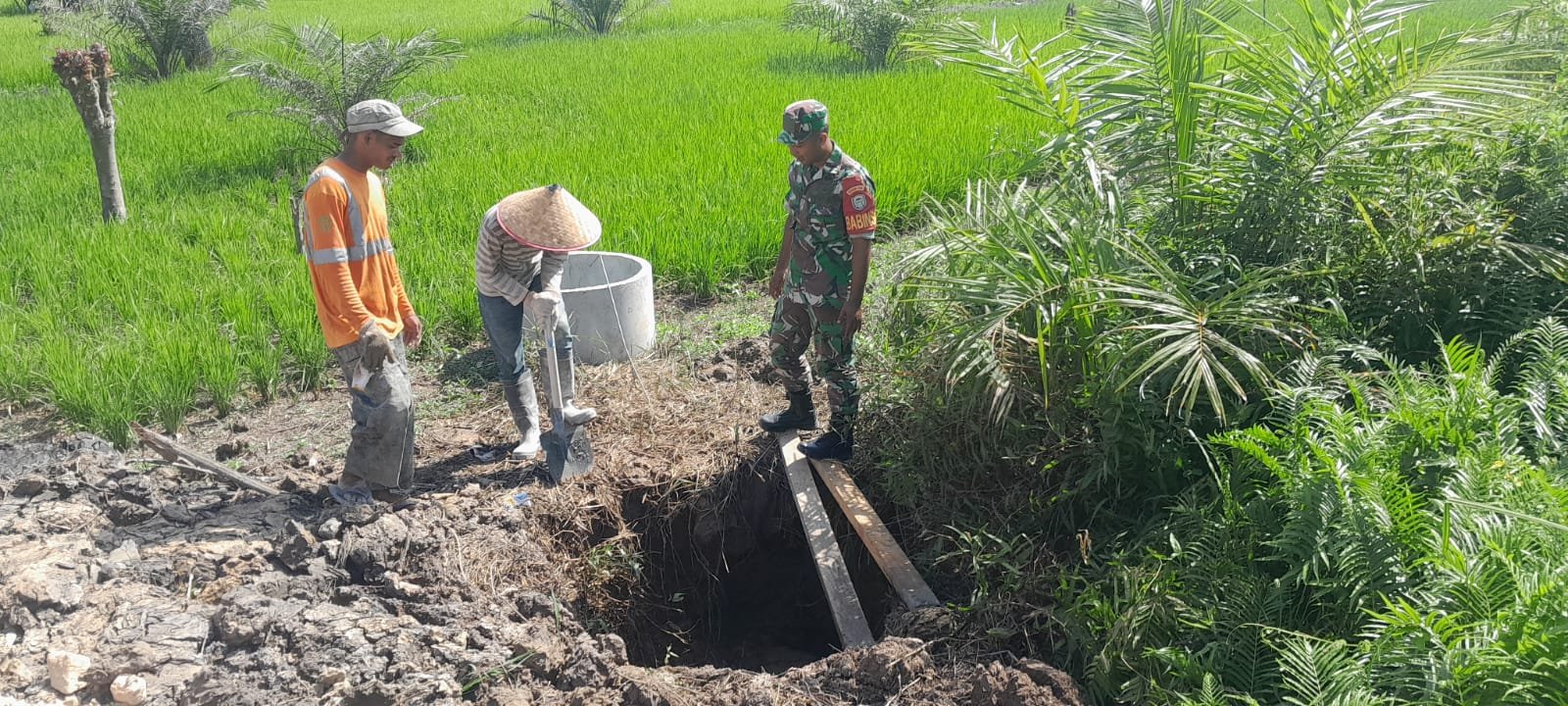 Dalam kegiatan tersebut, Babinsa mendampingi para petani yang sedang membuat sumur di area persawahan. Pembuatan sumur ini dilakukan sebagai upaya mengatasi kekurangan air akibat musim kemarau panjang yang berdampak pada kondisi sawah dan aktivitas pertanian warga.