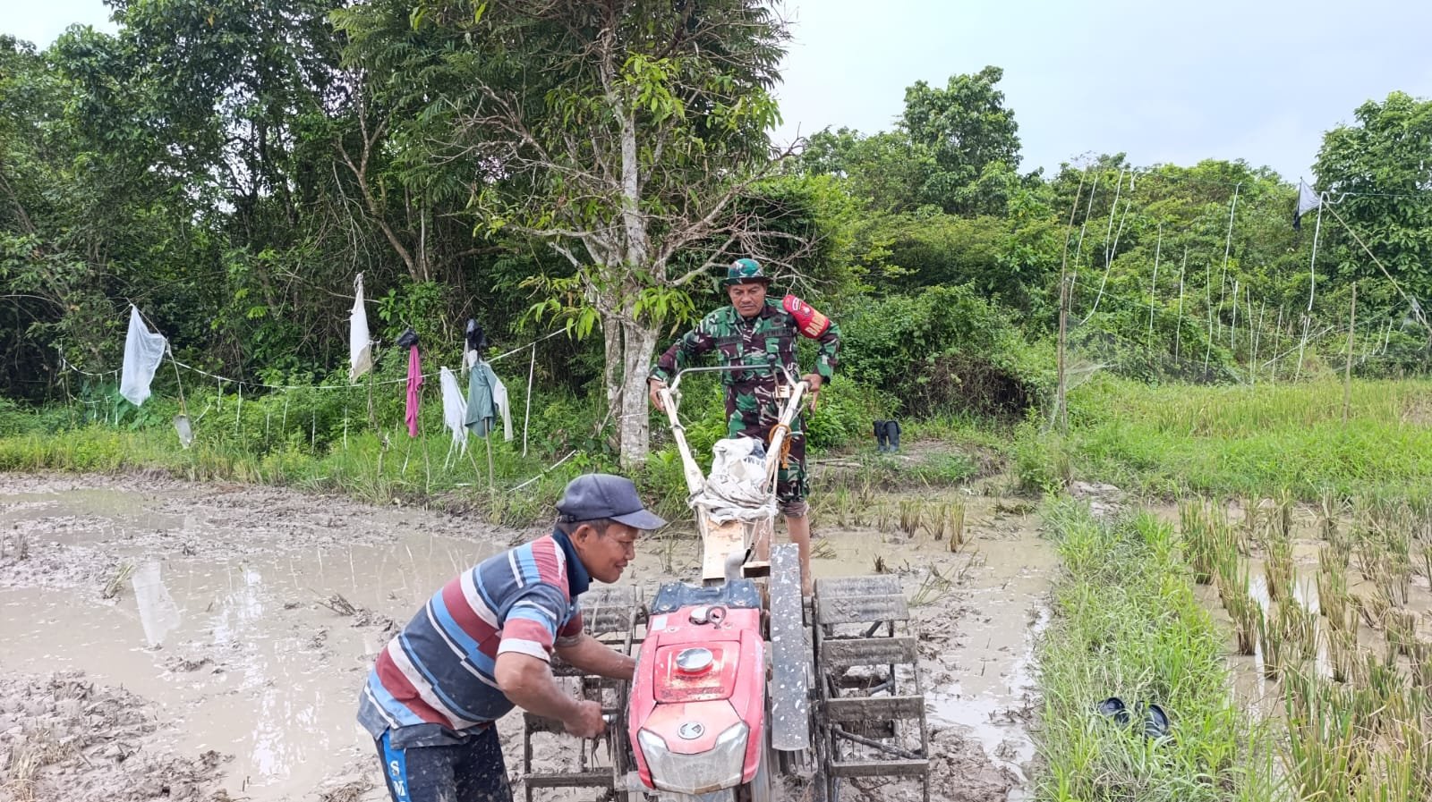 TAPIN – Di tengah hamparan sawah yang basah dan berlumpur, tampak seorang prajurit TNI berdiri di atas alat pembajak tanah sambil mengarahkan traktor tangan. Kakinya tenggelam di lumpur, namun semangatnya tetap tegak. Pemandangan itu memperlihatkan kedekatan TNI dengan rakyat, khususnya para petani di pedesaan.