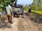 Banjar – Babinsa Desa Kayu Bawang, Koramil 1006-08/Gambut, Pelda Eriyanto melaksanakan kegiatan gotong royong bersama warga dalam rangka perbaikan jalan di Handil Murung RT 03 RW 02, Desa Kayu Bawang,