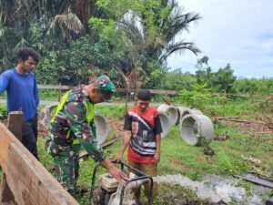 ACEH BARAT – Sebagai upaya mengatasi kesulitan sekaligus mewujudkan tempat tinggal yang layak huni, Babinsa Koramil 04/Mrb Kodim 0105/Abar Serda Edi Hermanto berperan aktif melibatkan diri secara langsung dan turut