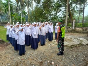 ACEH BARAT – Babinsa Koramil 08 Arongan Lambalek Kodim 0105/Aceh Barat, Serka Heri Jaya, melaksanakan kegiatan pembinaan dan pelatihan Peraturan Baris Berbaris (PBB) di sekolah SMPN 2 Arla di Desa