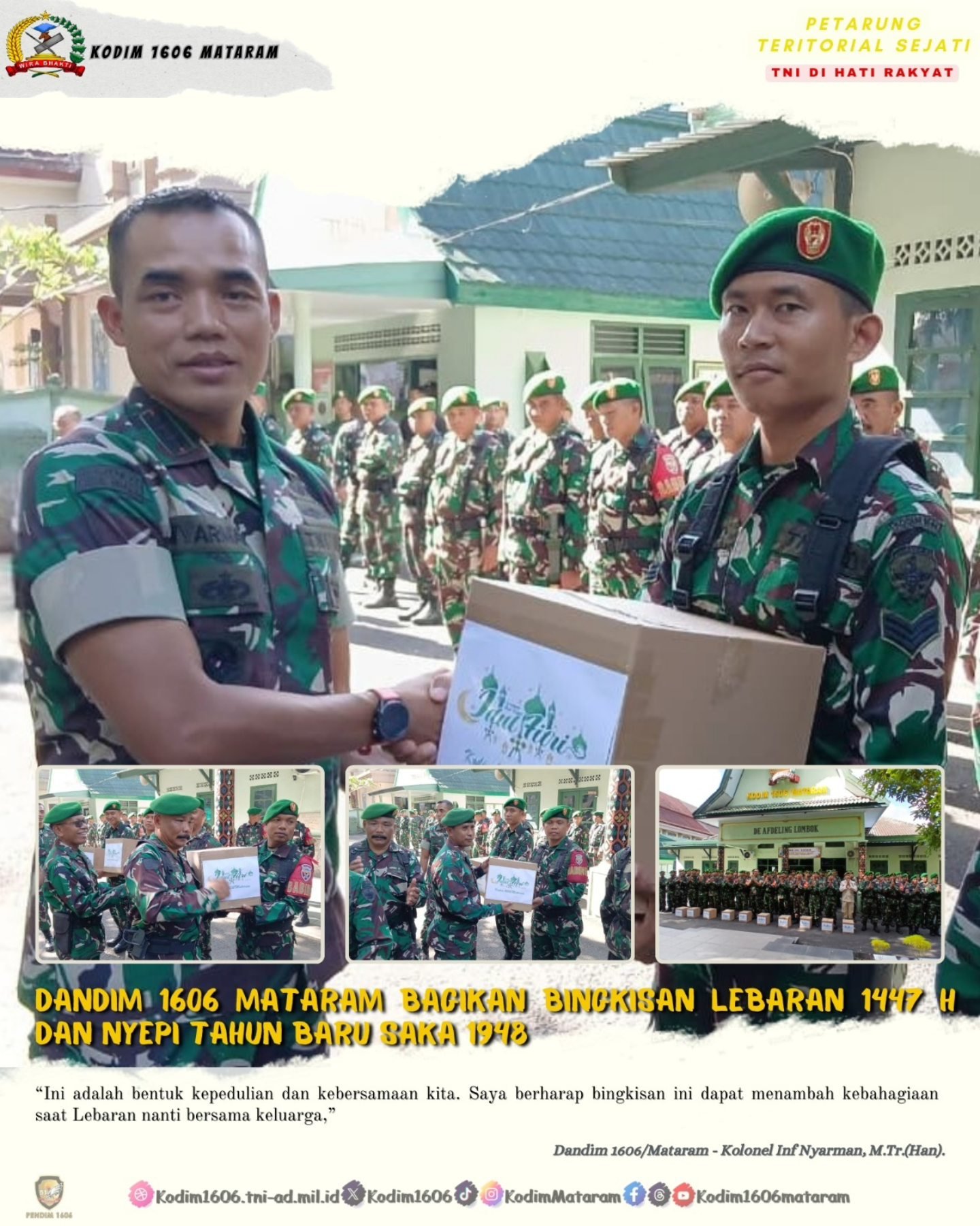Mataram, NTB – Momen penuh haru dan kebersamaan tercipta saat Komandan Kodim (Dandim) 1606/Mataram, Kolonel Inf Nyarman, M.Tr.(Han)., memberikan bingkisan Lebaran kepada anggota prajurit dalam apel cuti gelombang pertama. Acara tersebut berlangsung di Halaman Makodim, Jl. Pejanggik No.7, Kota Mataram, pada Selasa (17/3/2026).