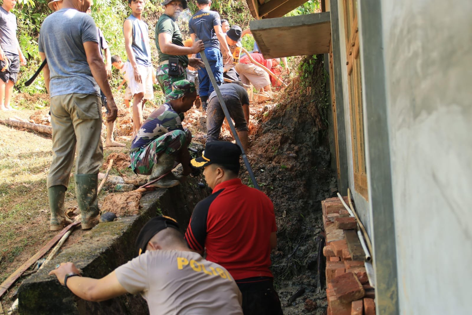 Suasana sempat mencekam saat material tanah dari tebing di belakang rumah tiba-tiba meluncur turun dan menutup sebagian bangunan milik Rismawan. Warga sekitar segera melaporkan kejadian tersebut kepada Babinsa yang saat itu langsung datang ke lokasi untuk memastikan kondisi penghuni rumah dalam keadaan selamat.