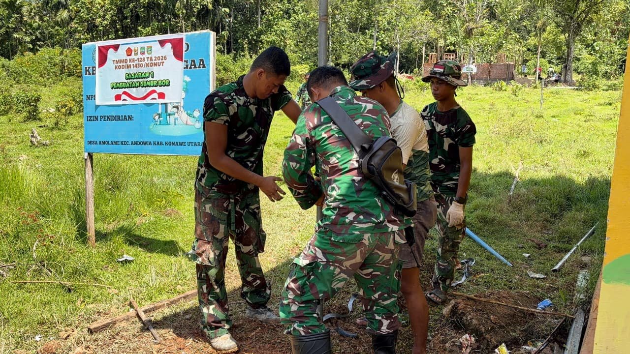 KONAWE UTARA – Dalam rangkaian program TMMD ke-128, Kodim 1430/Konawe Utara mempersembahkan proyek sumur bor yang sangat dibutuhkan oleh masyarakat. Dengan beroperasinya sumur bor ini di Desa Amolame, Kecamatan Andowia, para warga kini berpeluang untuk memperoleh air bersih dengan lebih mudah, Kamis (30/4/2026).