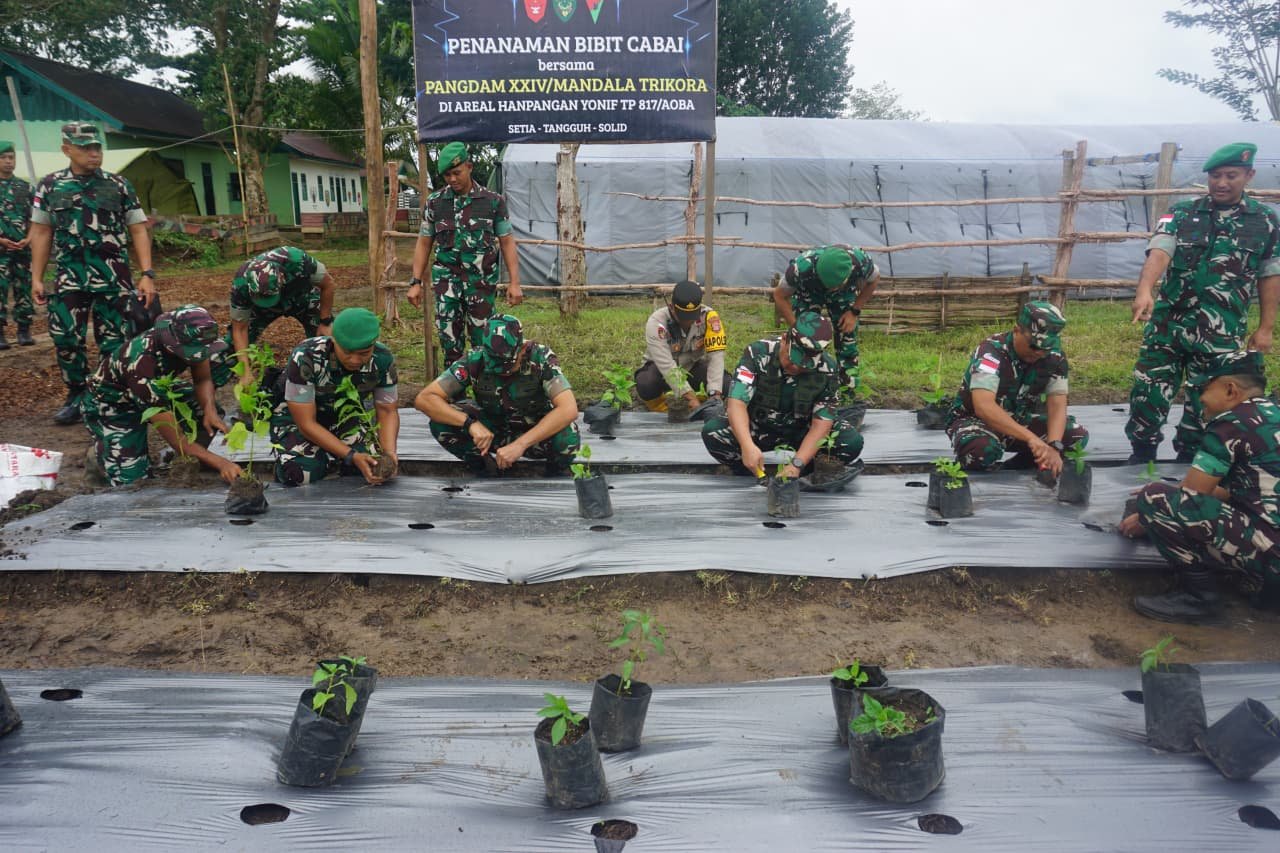 Sebagai bentuk dukungan nyata, Pangdam XXIV/MT bersama rombongan turut melaksanakan penanaman cabai dan jagung di kebun Yonif TP 817/Aoba. Kegiatan ini menjadi simbol semangat kebersamaan dan harapan agar program pertanian dan peternakan yang dijalankan terus berkembang dan berkelanjutan.