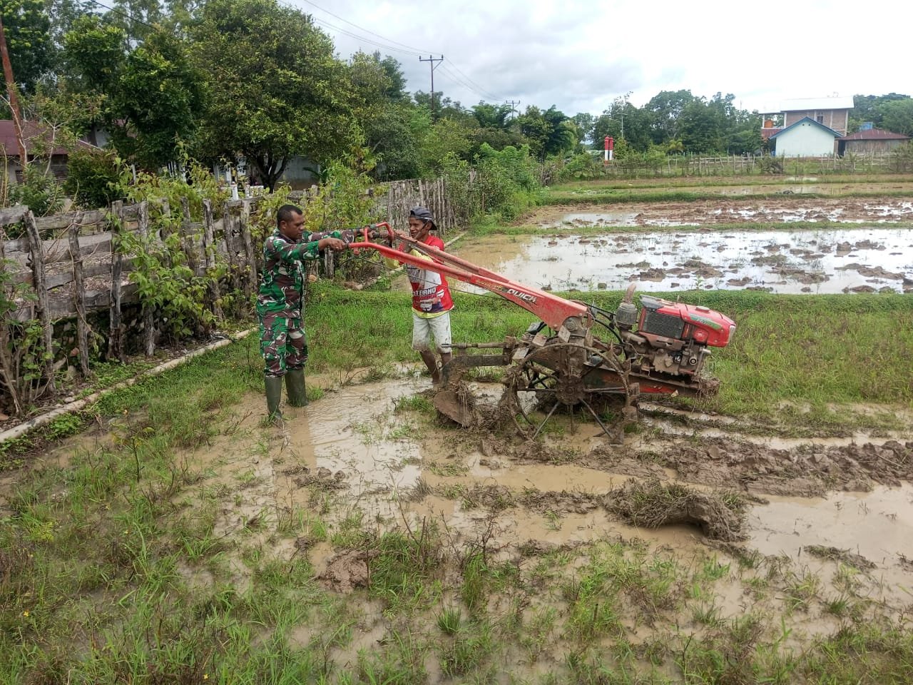 KODIM 1605/BELU, pada Selasa (13/1/2026), Anggota Satgaster Pos Halibete 2, Serda Hironimus Kono, terjun langsung membantu petani lokal dalam proses pembajakan sawah. Kegiatan ini berlangsung di Dusun Lahurus, Desa Fatulotu, Kecamatan Lasiolat, Kabupaten Belu. Tindakan ini diambil untuk mempercepat penyiapan lahan sawah milik Bapak Theodorus Nahak, agar tanah menjadi siap untuk masa tanam padi.