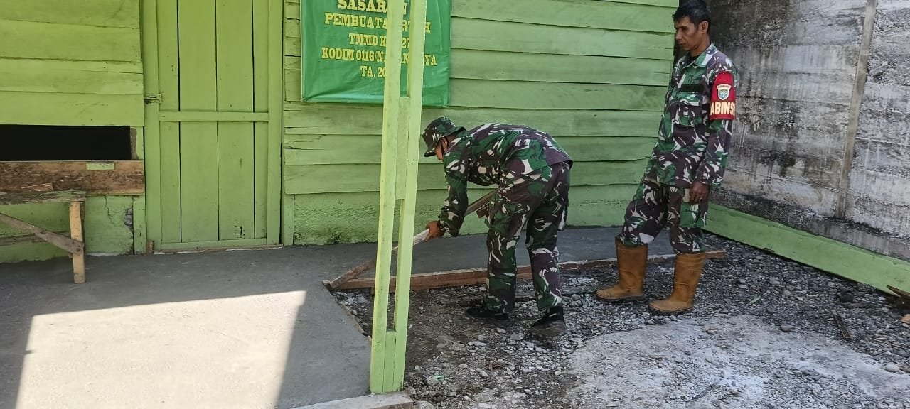 Beberapa anggota Satgas terlihat bekerja saling membantu. Ada yang mengangkat papan, ada pula yang merapikan sisi lantai agar tetap rapi. Gerakan mereka sederhana, namun menyimpan makna besar bagi warga yang menerima manfaat program tersebut.