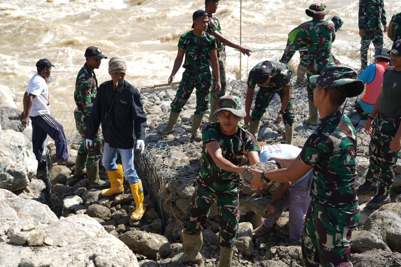 Dalam rangka pemulihan pascabanjir yang melanda Kecamatan Beutong Ateuh Benggalang, Kabupaten Nagan Raya, prajurit Korem 012/TU dan Yon TP 856 bersama warga secara gotong royong terus menyiapkan bronjong sebagai dasar jembatan. Sementara itu, Dinas Pekerjaan Umum (PU) menggunakan alat berat excavator untuk memperbaiki aliran sungai lama serta menyiapkan jalan sementara yang sebelumnya terputus.