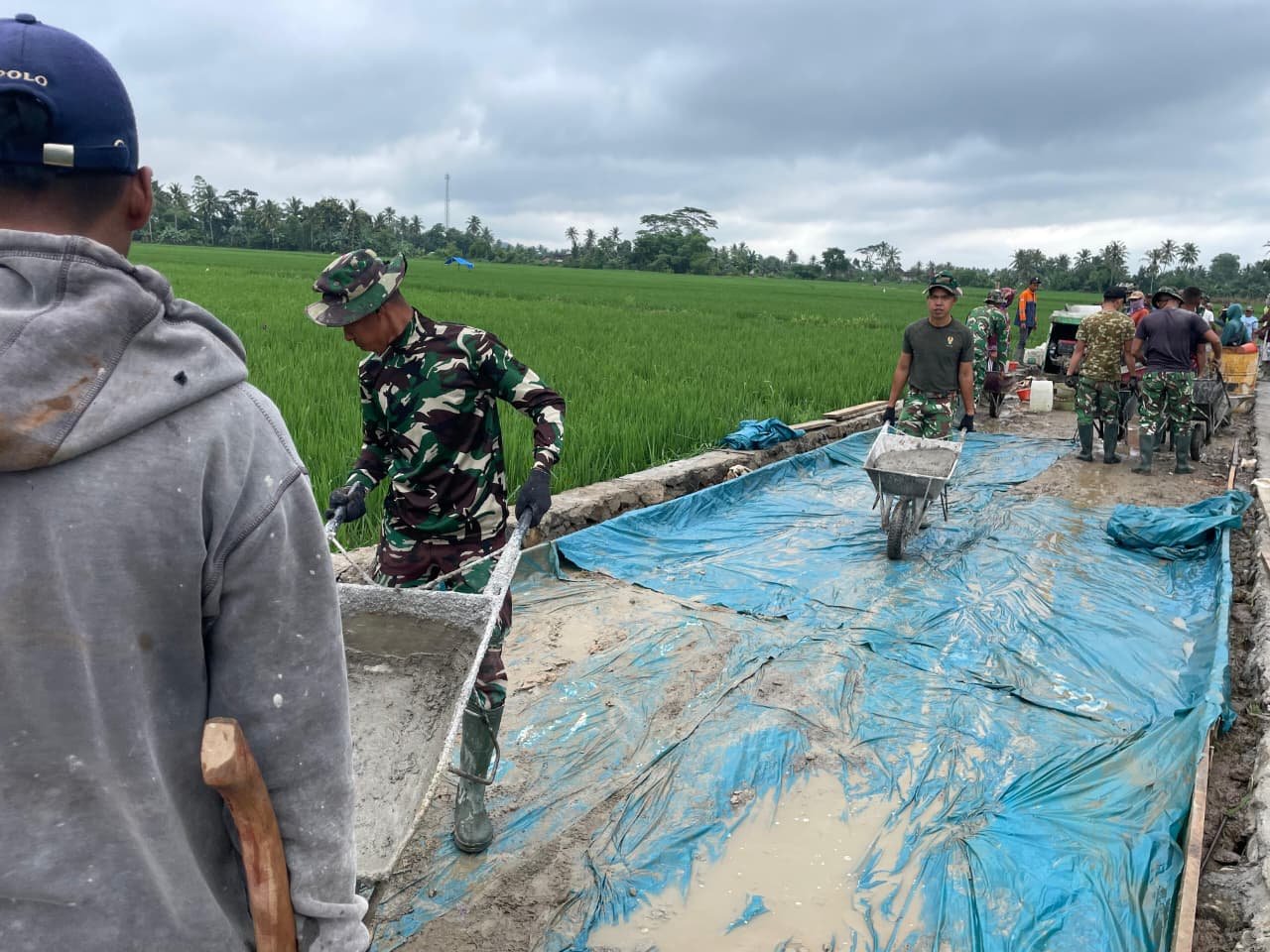Angkong yang diisi dengan semen cor melaju perlahan menuju titik rabat beton. Setiap dorongan tidak hanya memindahkan adukan beton, tetapi juga memperkuat harapan masyarakat untuk memiliki jalan yang tidak lagi licin saat hujan dan bebas debu saat kemarau. Dengan seragam loreng yang basah oleh keringat dan sepatu yang terbalut lumpur, wajah para prajurit terpancar dengan kebanggaan.