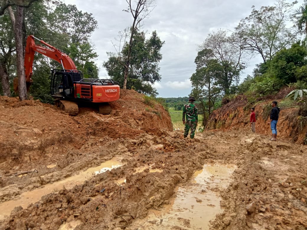 Pengerjaan badan jalan sepanjang 3.100 meter dengan lebar 6 meter yang berlokasi di Desa Ujong Blang tetap berlangsung walaupun sejumlah titik pekerjaan tergenang air akibat hujan. Kegiatan di lapangan tetap berjalan dengan dukungan alat berat excavator dan kerja sama anggota Satgas TMMD, Rabu (18/2/2026).