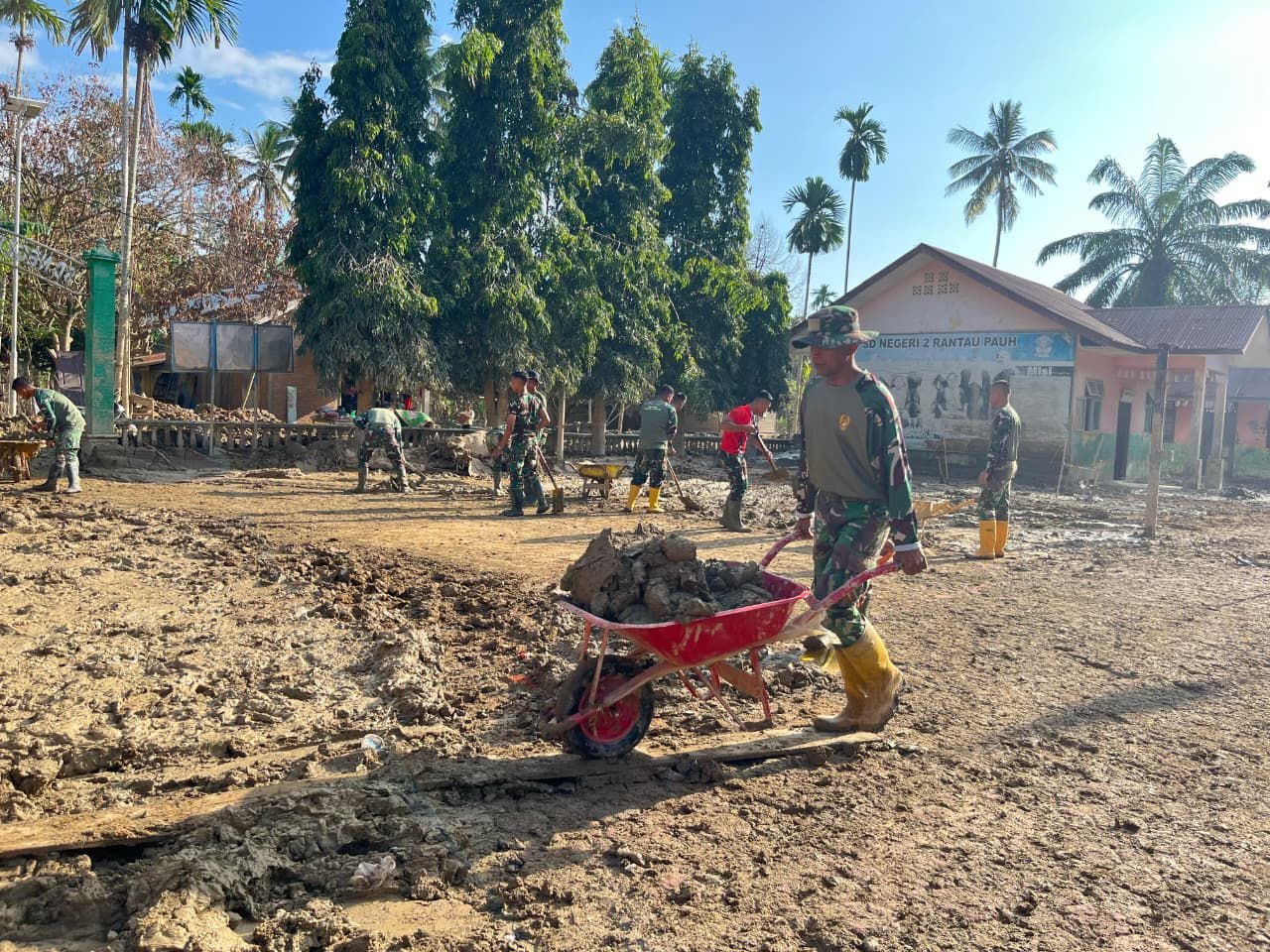 Aceh Tamiang – Prajurit Korem 012/TU berpacu dengan waktu melaksanakan karya bakti pembersihan SDN 2 Rantau Pauh, Kecamatan Rantau, Kabupaten Aceh Tamiang, sebagai bentuk kepedulian TNI terhadap dunia pendidikan dan masyarakat, Selasa (13/01/2026).