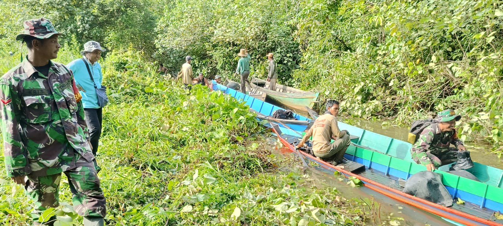 Kegiatan tersebut dilakukan dengan menyusuri aliran sungai menggunakan perahu kecil bermesin yang oleh warga setempat biasa disebut ketinting. Bersama masyarakat, para Babinsa memotong ranting, membersihkan semak belukar, serta menyingkirkan tanaman liar yang menghambat jalur transportasi air.