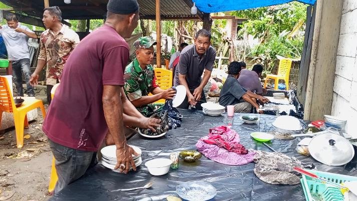 Sejak pagi hari, suasana di sekitar rumah warga tersebut tampak ramai dengan aktivitas kebersamaan. Warga saling bahu-membahu menyiapkan berbagai keperluan kenduri, mulai dari memasak, menata tempat, hingga memastikan seluruh rangkaian acara berjalan lancar. Di tengah kesibukan itu, kehadiran Serka Parwoto turut menambah semangat warga dalam bekerja.