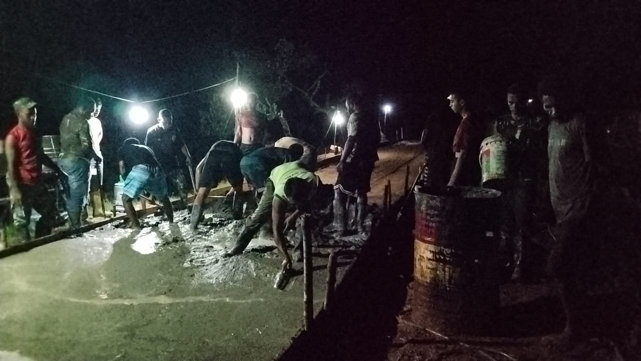 BOVEN DIGOEL – Demi mengejar target penyelesaian pembangunan jalan tepat waktu, 55 personel Satgas TNI Manunggal Membangun Desa (TMMD) ke-126 Kodim 1711/Boven Digoel terus bekerja tanpa kenal lelah. Para prajurit bersama masyarakat bergotong royong melakukan pengecoran jalan hingga malam hari di lokasi sasaran fisik TMMD, Minggi Malam (26/10/2025).