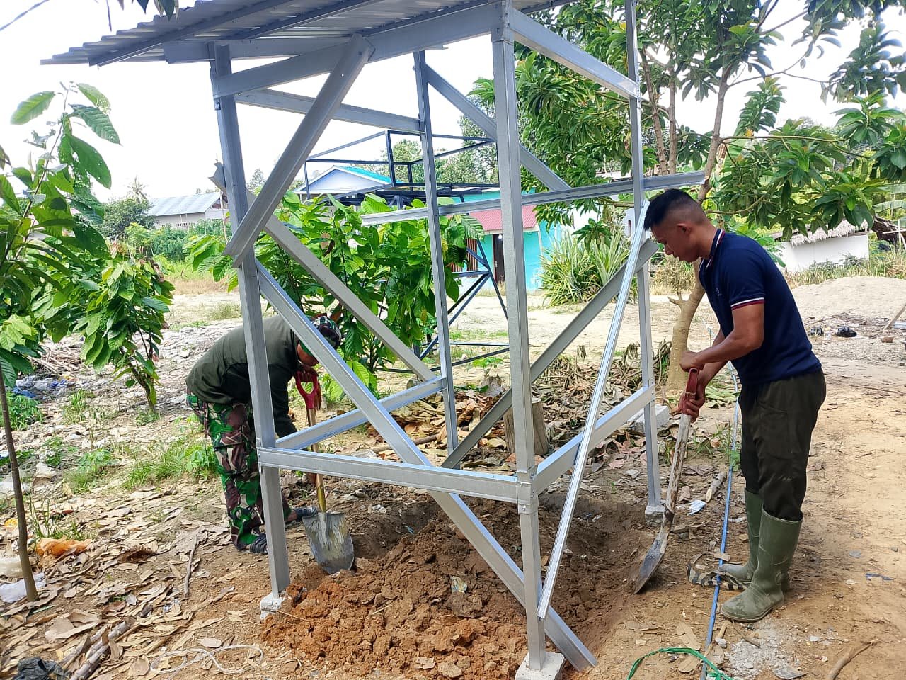Anggota Satgas TMMD bekerja berkolaborasi dengan masyarakat lokal dalam rangka memasang struktur dan atap tersebut. Aktivitas ini menjadi komponen esensial dalam upaya menciptakan fasilitas sanitasi yang layak dan mendukung kesehatan masyarakat.