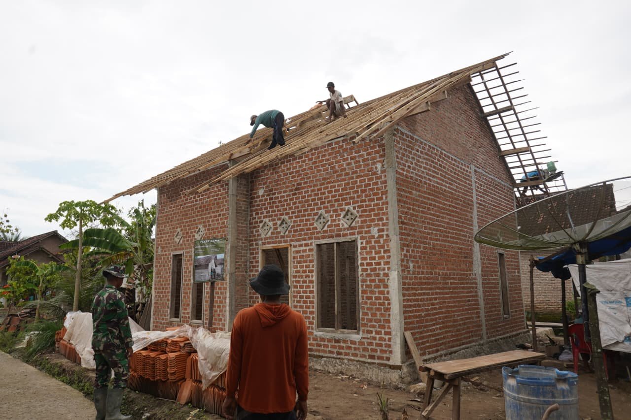 Pesawaran – Proyek pembangunan Rumah Tidak Layak Huni (RTLH) yang merupakan bagian dari program TNI Manunggal Membangun Desa (TMMD) ke-127 Kodim 0421/LS menunjukkan kemajuan yang signifikan. Saat ini, rumah milik Bapak Ngadino telah mencapai tahap penting, yaitu siap untuk pemasangan genteng.