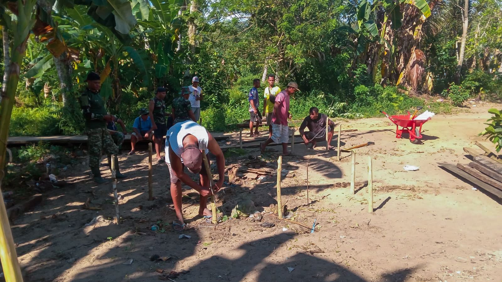 Kaimana – Suasana gotong royong hadir dalam pelaksanaan Program TNI Manunggal Membangun Desa (TMMD) ke-127 yang diadakan oleh Kodim 1804/Kaimana. Melalui program ini, satu unit rumah tipe 36 sedang dibangun di Kampung Sisir 2, Kabupaten Kaimana. Saat ini, pembangunan rumah yang diperuntukkan bagi Ibu Evelina Surawi sedang berada di tahap awal pengerjaan.