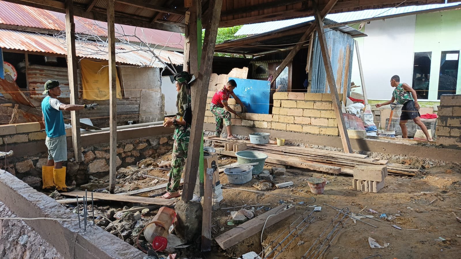 KENDARI – Program Rehabilitasi Rumah Tidak Layak Huni (RTLH) yang menjadi bagian dari TMMD ke-127 di Kelurahan Petoaha menunjukkan kemajuan yang signifikan pada Sabtu, 28 Februari. Dalam pelaksanaan program ini, para personel dari Kodim 1417/Kendari terlihat bekerja berdampingan dengan masyarakat setempat, termasuk Ibu Ninda selaku pemilik rumah yang sedang direnovasi.