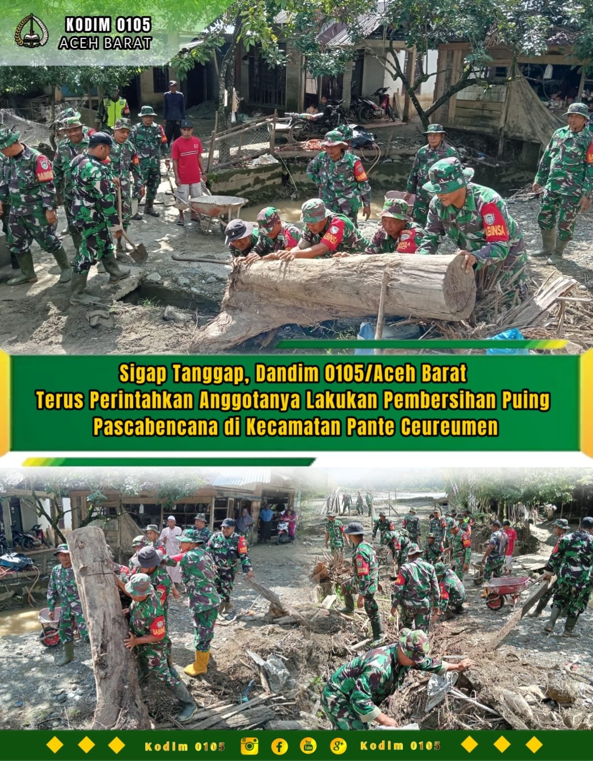 ACEH BARAT – Wujud kepedulian dan respons cepat terhadap masyarakat terdampak bencana kembali ditunjukkan oleh Komando Distrik Militer (Kodim) 0105/Aceh Barat. Pasca terjadinya bencana alam, Dandim 0105/Aceh Barat Letkol Inf S. Kembaren, S.E., M.I.P., CFrA., langsung memerintahkan jajarannya untuk turun ke lapangan membantu proses pembersihan puing-puing dan material sisa bencana. Seperti yang dilakukan hari ini, puluhan prajurit bersama masyarakat melaksanakan pembersihan di Desa Ketambang, Kecamatan Pante Ceureumen, Rabu (14/01/2026).