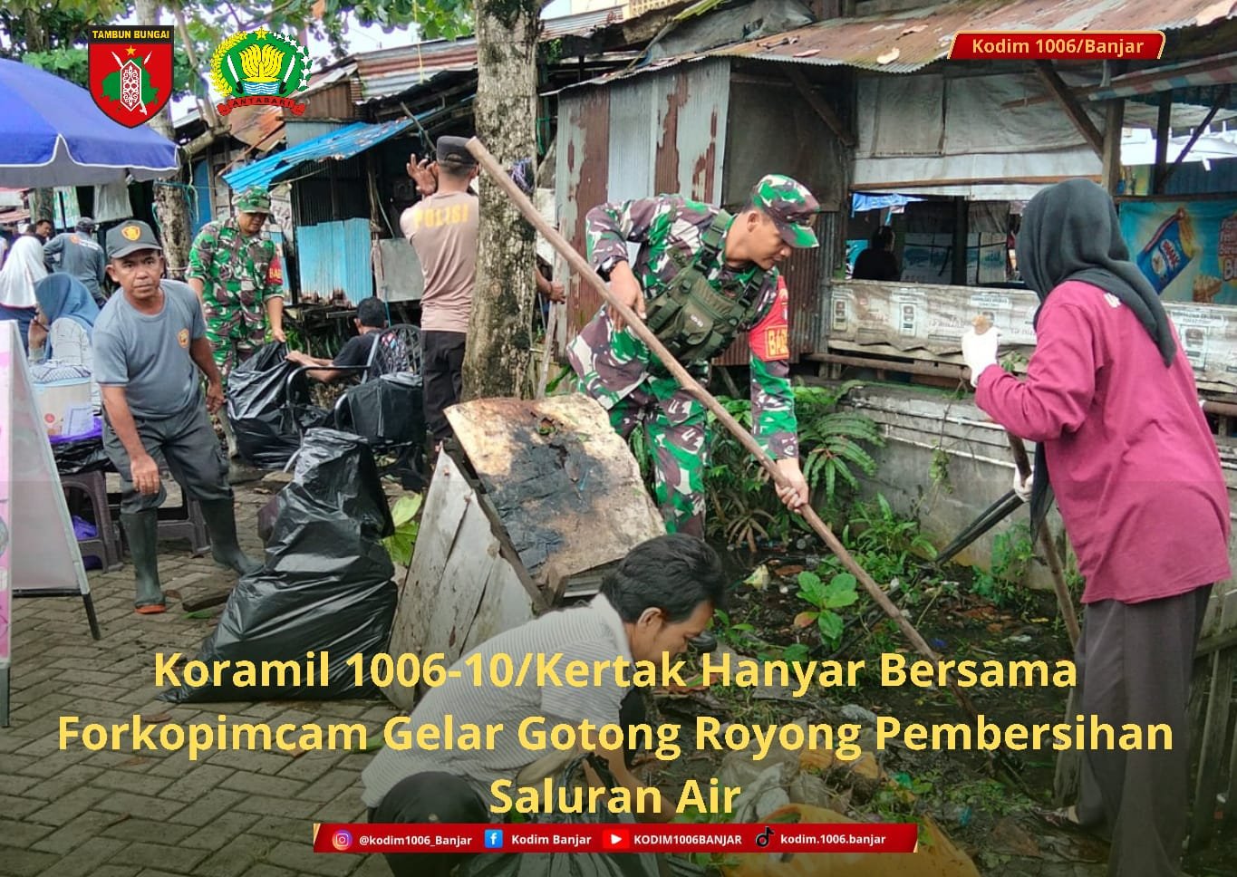 BANJAR – Koramil 1006-10/Kertak Hanyar Kodim 1006/Banjar melaksanakan kegiatan gotong royong pembersihan aliran air dan selokan bersama unsur Kecamatan Kertak Hanyar, Polsek Kertak Hanyar, Puskesmas Kertak Hanyar, PD Pasar Kertak Hanyar, Ketua RW dan RT, Linmas Kelurahan Kertak Hanyar I, serta pihak sekolah SDN Kertak Hanyar 1 dan SDN Kertak Hanyar 3.