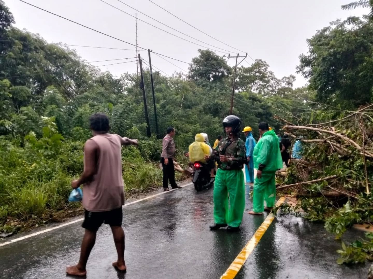 Nagekeo — Personel Koramil 1625-03/Boawae melalui Posramil Nangaroro bersama anggota Polsek Nangaroro melaksanakan pengamanan dan pengaturan arus lalu lintas di lokasi longsor jalur trans Ende–Bajawa, tepatnya di KM 48 Sorowea, Desa Woedoa, Kecamatan Nangaroro, Kabupaten Nagekeo, Kamis (12/2/2026) pukul 17.30 WITA.