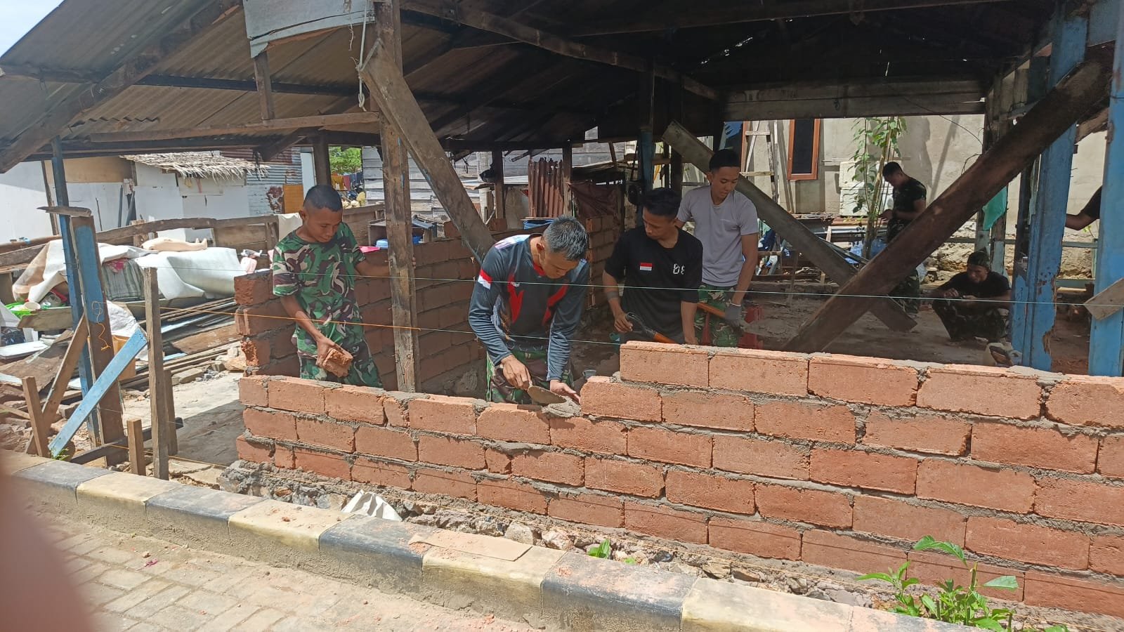 Dalam tahap pemasangan batu bata, anggota TNI menunjukkan dedikasi tinggi dengan melakukan pekerjaan ini dengan cermat dan teratur. Setiap lapisan bata yang dipasang diperhatikan hingga detail terkecil, untuk memastikan bahwa dinding yang dibangun memiliki kekuatan, ketepatan, dan daya tahan yang optimal.