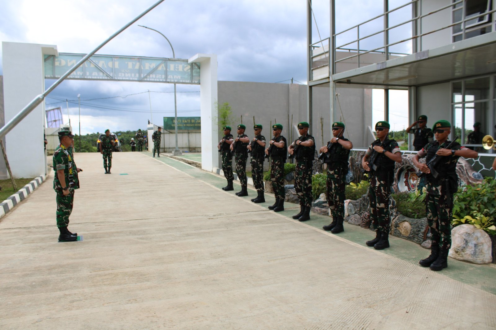 Pangdam VI/Mlw tiba di MA Yonif TP 826/BTB disambut dengan prajurit dengan membawa beberapa pejabat Kodam VI/Mlw yaitu Asisten Logistik Kasdam VI/Mlw Kolonel Inf M. Zulnalendra Utama dan Kepala Zeni Kodam VI/Mlw Kolonel Czi Alpi Fahrudin Nur, S. E.