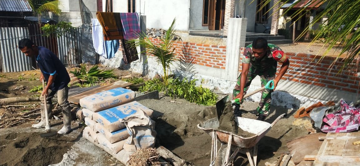 CEH JAYA – Wujud kebersamaan dan meningkatkan kerja sama di wilayah binaan, Babinsa Koramil 0114-01/Jaya Koptu Rahmat Putra membantu mencampur adukkan semen untuk pembuatan jalan teras rumah milik warga Desa Pante Cermin Kec. Jaya Kab. Aceh Jaya, Senin (23/12/2024)