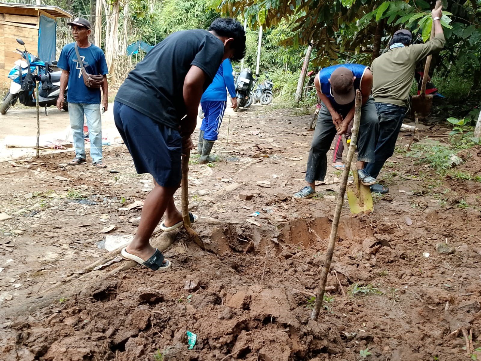 Pantauan di lokasi menunjukkan personel Kodim 1003/HSS dan warga saling bahu membahu melaksanakan tahap awal konstruksi. Kegiatan yang sedang berlangsung meliputi penggalian pondasi yang menjadi titik awal berdirinya jembatan gantung untuk memastikan kekuatan struktur di medan pegunungan dan pengedropan material bahan bangunan untuk pengecoran didatangkan secara bertahap mengingat sulitnya akses menuju lokasi.