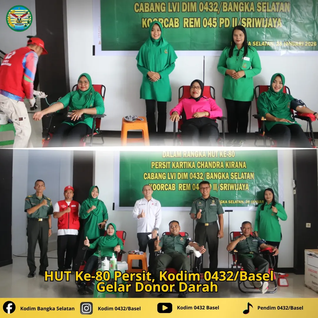 BANGKA SELATAN – Dalam rangka merayakan Hari Ulang Tahun (HUT) ke-80 Persit Kartika Chandra Kirana yang jatuh pada tahun 2026, Persit Kartika Chandra Kirana Cabang LVI Dim 0432/Bangka Selatan melaksanakan kegiatan donor darah. Acara ini berlangsung di Makodim 0432/Bangka Selatan, Jalan Gadung Koba, Kecamatan Toboali, pada Selasa, 28 Januari 2026.