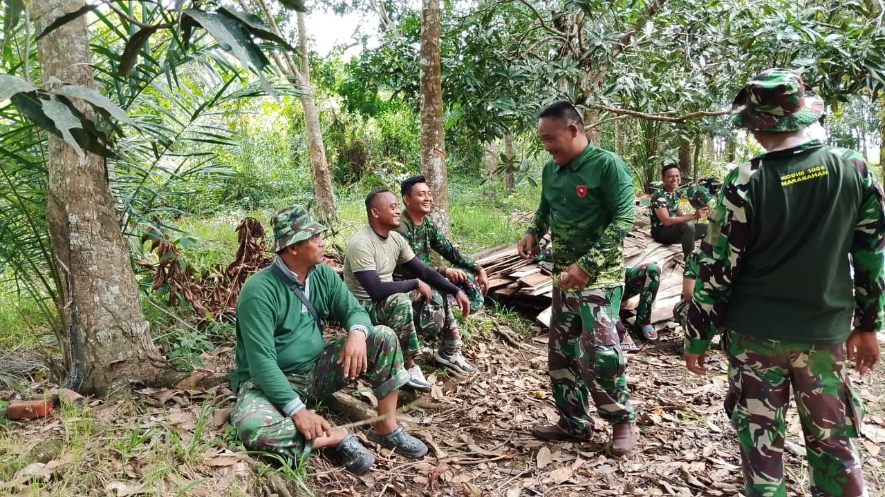 BARITO KUALA – Suasana hangat dan akrab terlihat di lokasi perehaban Rumah Tidak Layak Huni (RTLH) milik Kai Zaini, Desa Tumih, Kecamatan Wanaraya. Di sela kesibukan program TMMD Ke-126 Kodim 1005/Barito Kuala, Peltu Harimaladi terlihat bersenda gurau bersama rekan-rekannya saat jam istirahat.
