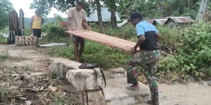 LANNY JAYA – Satgas Yonif 614/Raja Pandhita Pos Popome menyambangi salah satu warga yang sedang berduka. Personel Pos Popome melayat ke rumah duka Almarhum Bapak Yolek Murib (53) merupakan warga