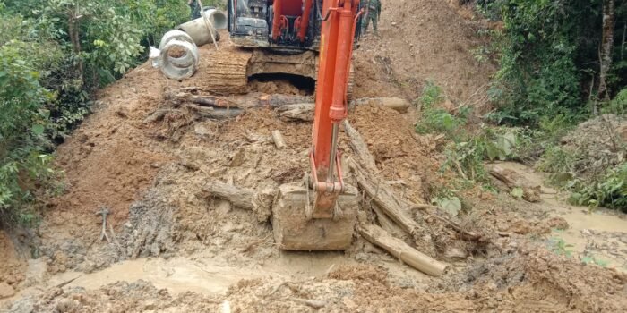 HULU SUNGAI UTARA – Babinsa Koramil 1001-06/Amuntai jajaran Kodim 1001/HSU-BLG melaksanakan gotong royong bersama warga memperbaiki jalan yang rusak di desa Palimbangan Sari, Kecamatan Haur Gading, Senin, (04/11). Serka M.