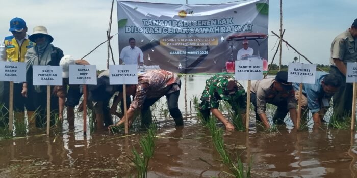 HULU SUNGAI UTARA – Bentuk dukungan program penghijauan, Pjs. Danramil 1001-10/Babirik Kodim 1001/HSU-BLG Serma Abdirahim dan anggota Koramil bersama warga melaksanakan penghijauan penanaman pohon di Desa Sungai Jamjam, Kecamatan Babirik,