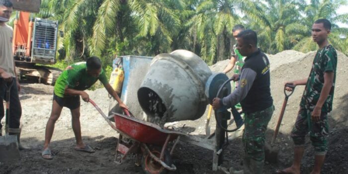 ACEH BARAT – Babinsa Koramil 08 Arongan Lambalek Kodim 0105/Aceh Barat, Koptu Riansyah, bersama masyarakat desa binaan merehab masjid di Desa Drien Rampak Kecamatan Arongan Lambalek Kab Aceh Barat, Senin