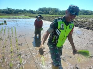 ACEH BARAT – Babinsa Koramil 08/Arongan Lambalek Kodim 0105/Aceh Barat, Sertu Agus Susanto, mendampingi warga desa binaan menanam padi di Desa Cot Buloh Kec Arongan Lambalek Kab Aceh Barat, Selasa (05/11/2024).