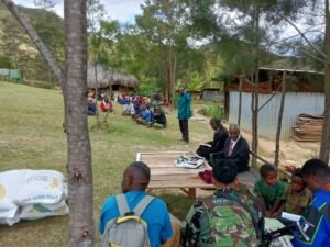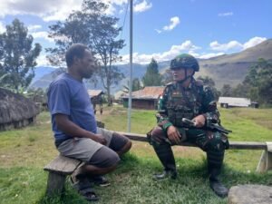 LANNY JAYA – Danpos Tiom Lettu Inf Mulyadi beserta 10 personel berkunjung ke rumah tokoh masyarakat Dukom Bapak Arnold (59) yang bertempat di Kampung Dukom, Distrik Tiom, Kabupaten Lanny Jaya,