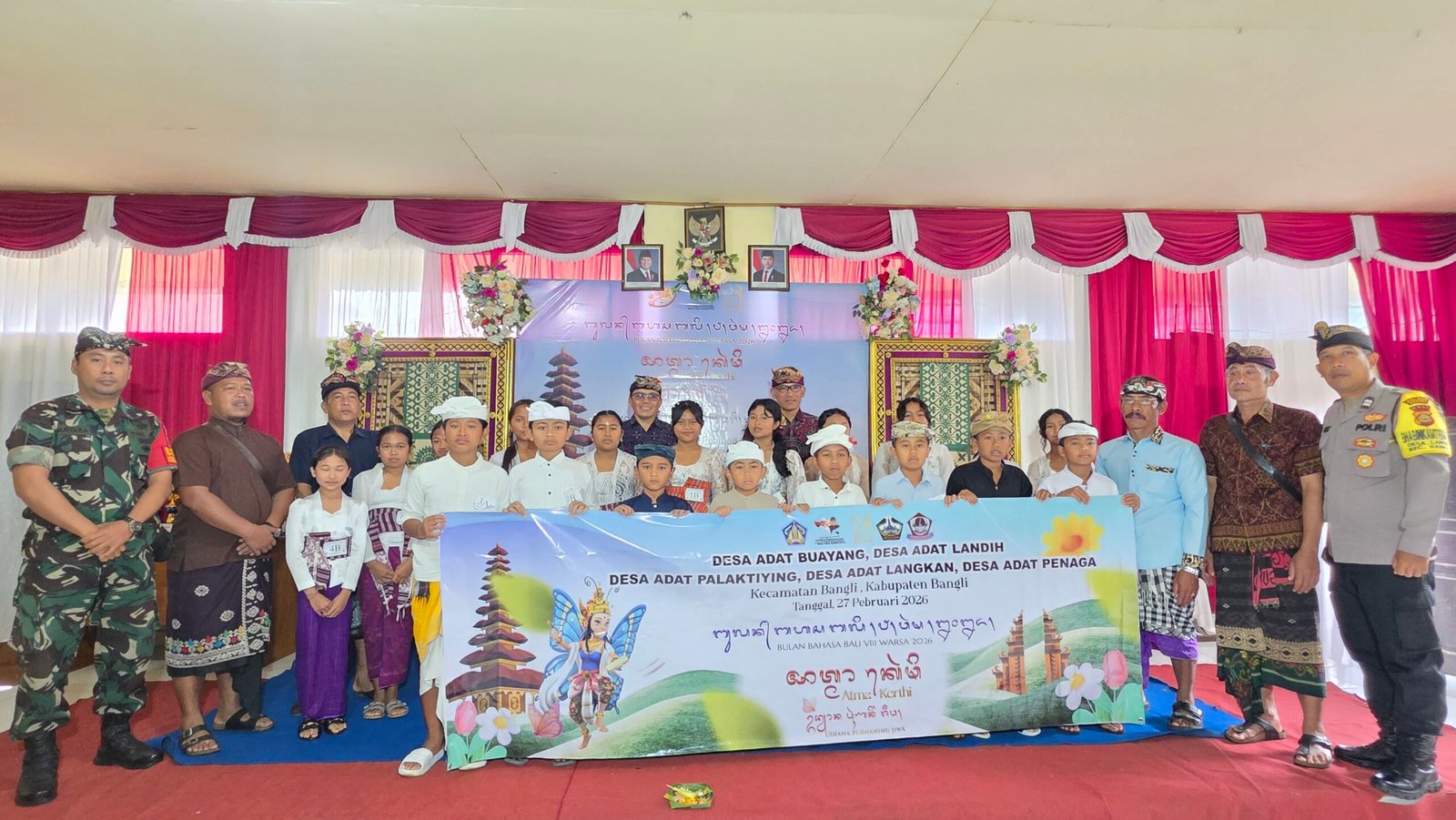 Bangli – Dalam upaya menjaga Bahasa, Aksara, dan Sastra Bali, Babinsa Desa Landih, Koramil 01/Bangli, Kodim 1626/Bangli, Serma I Komang Juni Suantara, bersama dengan Bhabinkamtibmas Desa Landih turut berpartisipasi dalam acara Bulan Bahasa Bali ke VIII tahun 2026. Kegiatan tersebut berlangsung di Ruang Pertemuan Kantor Desa Landih, Kecamatan Bangli, pada hari Jumat, 27 Februari 2026.